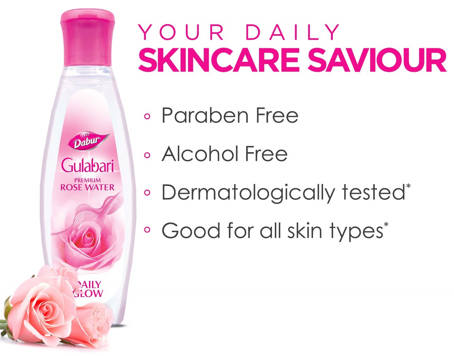 Invigorate, refresh and cleanse your skin with the goodness of natural rose extracts! Dabur Gulabari Rose Water is a natural toner that cleanses your skin from deep within ridding it of any dirt, grime or foreign bodies that can damage your skin. Apply it directly on the skin or mix it with a face pack to get a glowing & radiant rose like skin. It is 100% natural, safe and effective remedy for all skin types.
