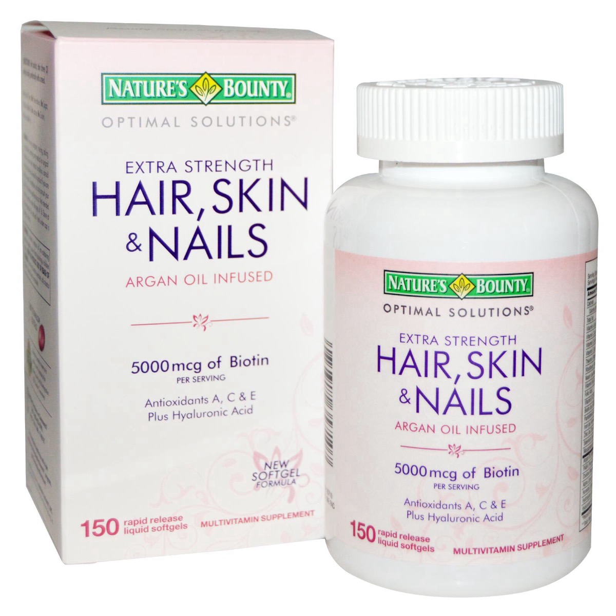 Being healthy is always beautiful! With Nature’s Bounty® Optimal Solutions® Hair, Skin & Nails formula, you’ll look good and feel great! It contains just the right balance of nutrients to help support lustrous hair, strong nails and vibrant skin. This innovative formula provides you with the vital nutrients your body needs to support your natural beauty from within. B Vitamins help with energy metabolism, and Biotin helps to maintain healthy hair and promote healthy nail growth by acting at the base of the nail – the nail matrix – where nail growth begins. Vitamin E and Vitamin C are antioxidants. Vitamin E contributes to skin health, and Vitamin C is involved in collagen production and formation, which forms the basis for vibrant skin. Vitamin A assists with skin maintenance, and overall health.