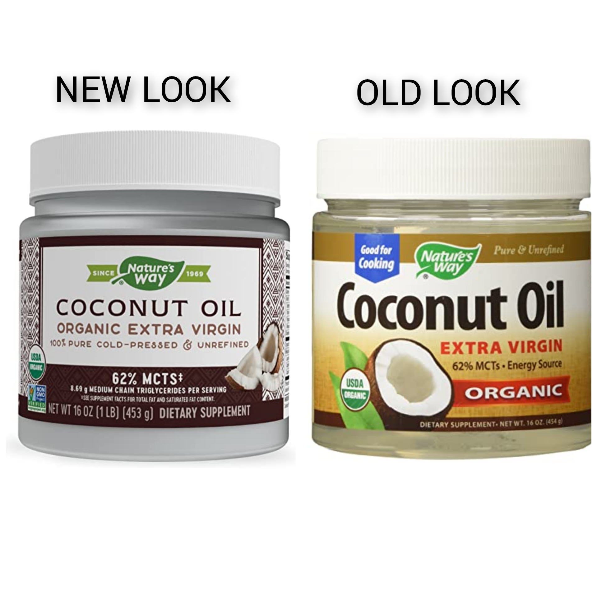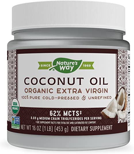 Organic Coconut Oil by Nature’s Way 16 oz Liquid Coconut oil is a natural energy source because it contains MCTs (medium chain) good fats the body uses to produce energy. . Our Coconut oil is certified Organic Non-GMO Pure extra virgin Cold pressed Hexane-free Unrefined Non-bleached has Zero trans fat and Zero hydrogenated fat. For skin care use Coconut oil as a moisturizing lotion. Place jar in warm water to liquefy then massage small amounts onto the skin. For hair care use Coconut oil as a conditioner.